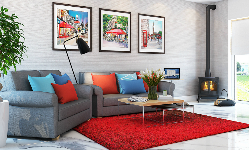 На фоне светлых серых стен и ярких аксессуаров хорошо смотрится мебель модного антрацитового цвета. Ковер в полоску добавит интерьеру помещения шарма и элегантности.