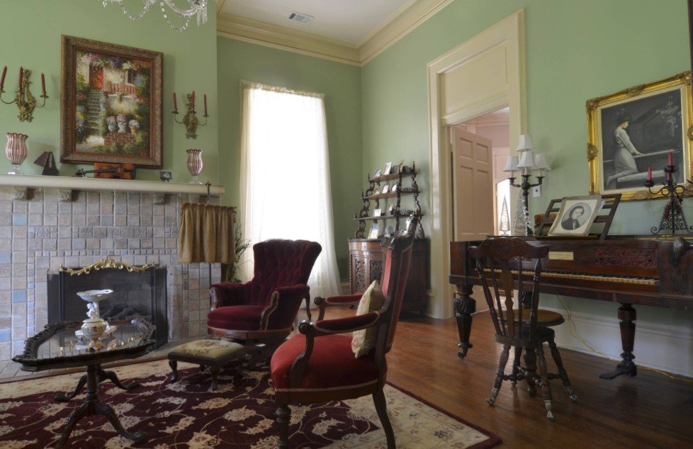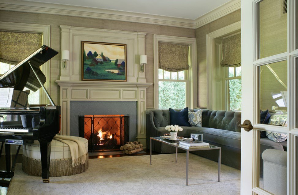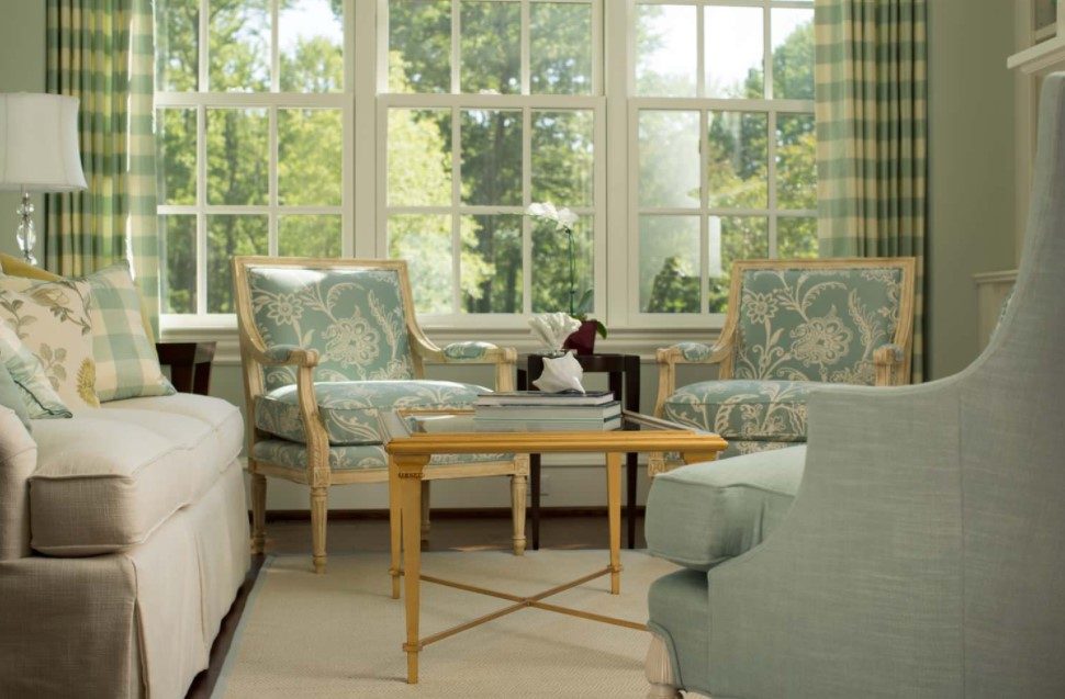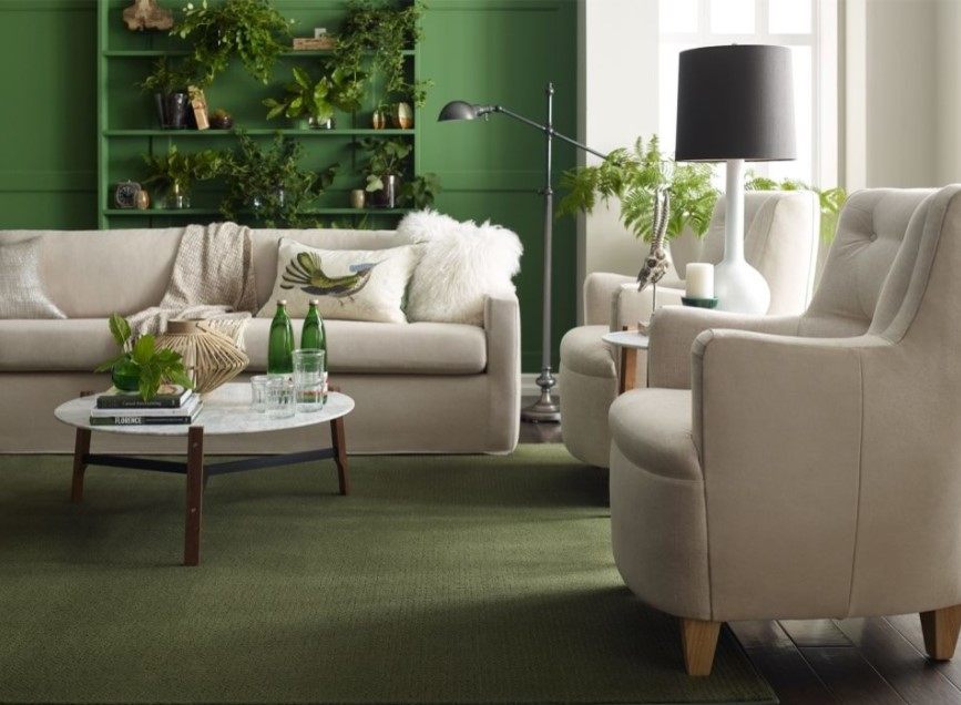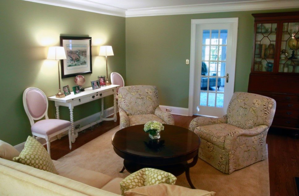 Приглушенный оттенок зелени или мята в компании с белым или бежевым актуальны для «деревенского» и романтичного прованса. Для оформления кантри в этом случае используются коричневый. Различные комбинации кофейного и серого оттенка в тандеме с тёмными зелёными тонами характерны для оформления гостиной в английском стиле.