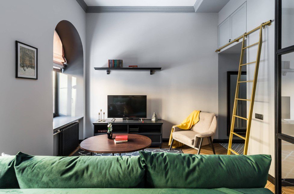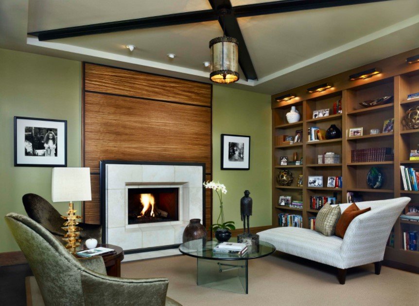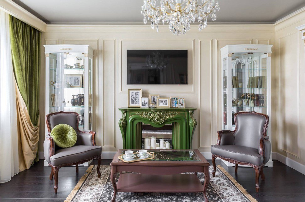 Как мы уже говорили, интерьер гостиной, выполненный в зелёных тонах, хоть и не пользуется мега популярностью, никогда не будет выглядеть банально, ведь всевозможные вариации зелёного всегда смотрятся свежо и обновлено, даже если речь идёт о белее глубоких оттенках