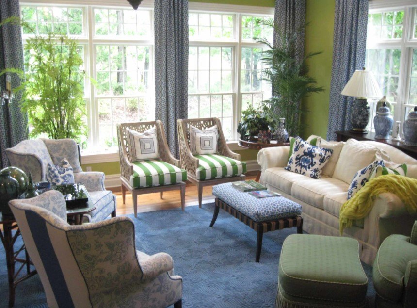 Еще одно необычное решение — голубой в гостиной в сочетании с фиолетовым или зеленым. Сначала может показаться, что цвета не совпадают. Однако, ища вдохновения, вы обнаружите, что это неправда. Поверьте, это отличное и оригинальное сочетание. Фиолетовый зал можно обустроить голубыми аксессуарами в виде декоративных бутылочек, подушек и рисунка. Голубой в сочетании с зеленью также отлично смотрится.