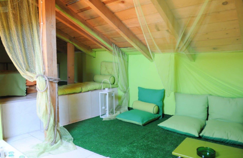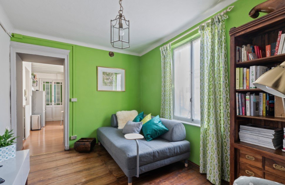 Необычно выглядит сочетание, при котором зеленый используется только для отделки одной из стен, остальные остаются желтыми.
