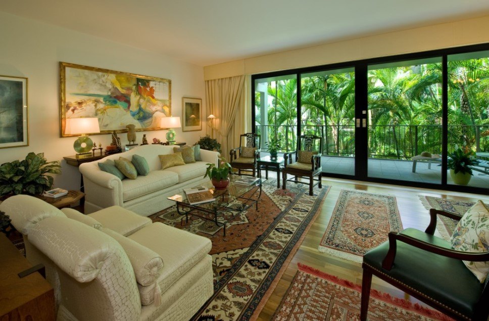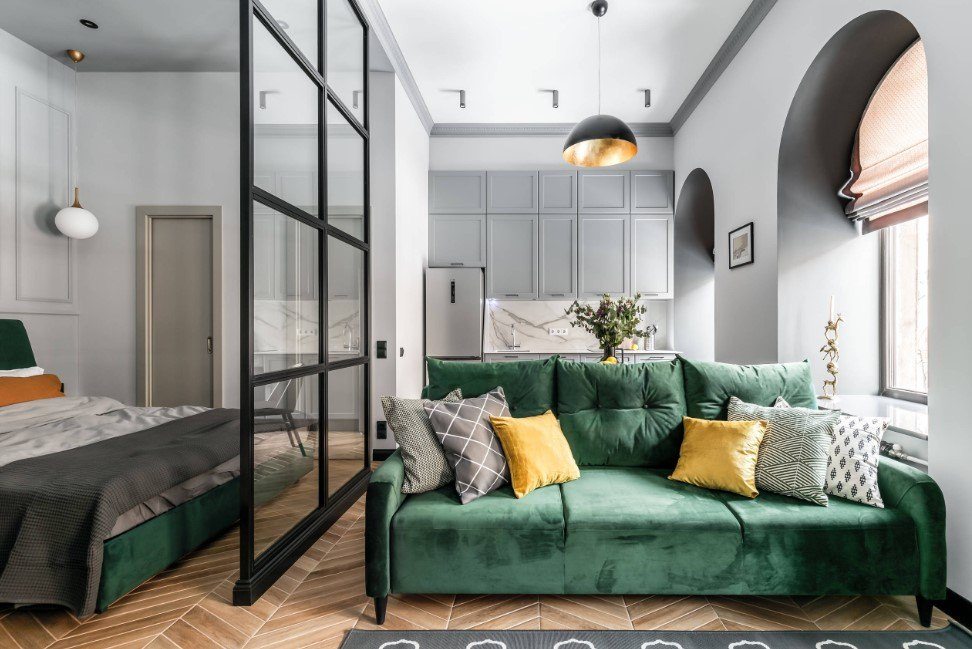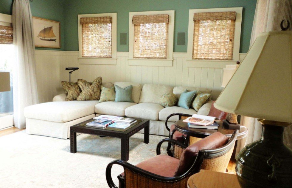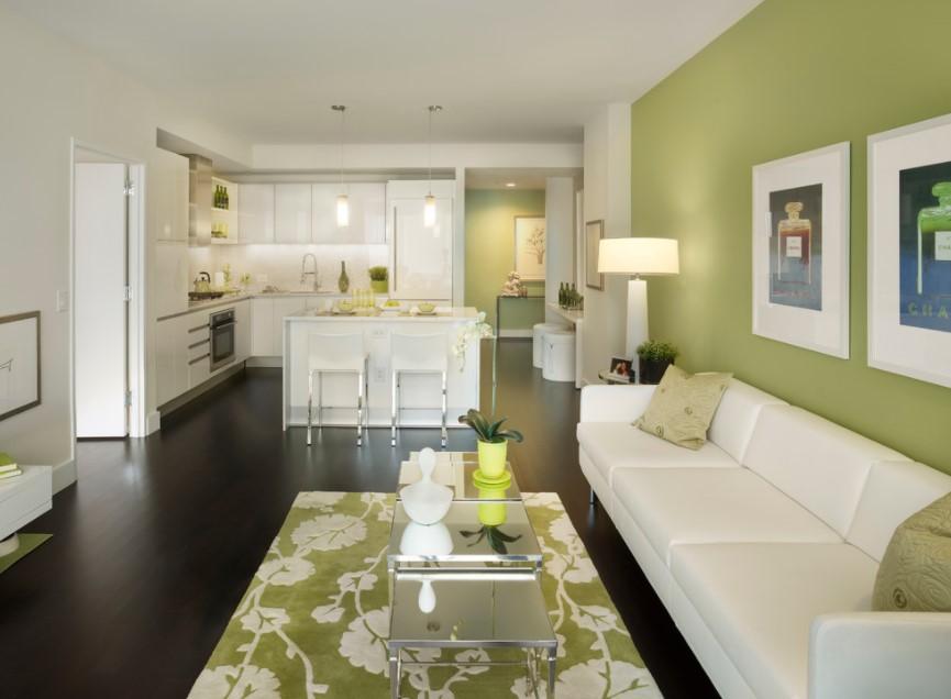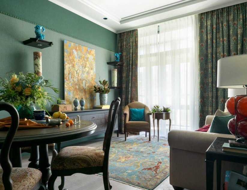 Средиземноморское направление благоволит к светлым зелёным тонам и оттенку морской волны. Гостиная комната в восточном стиле будет очень гармонично смотреться с нефритовым или оливковым зелёным.