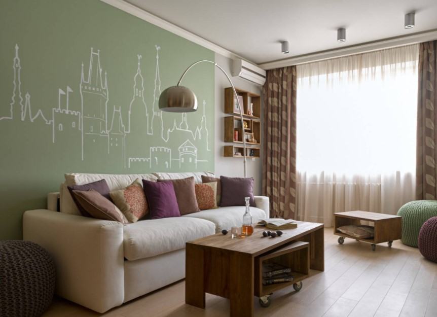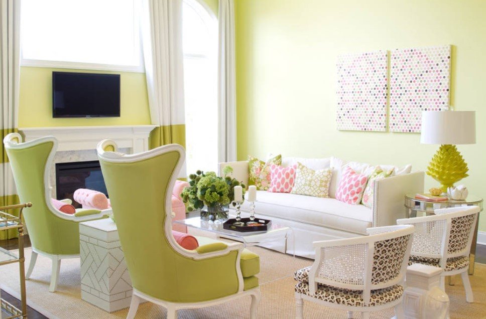 Салатовый оттенок со светло-желтым в декоре гостиной комнатыИсточник bergge.com