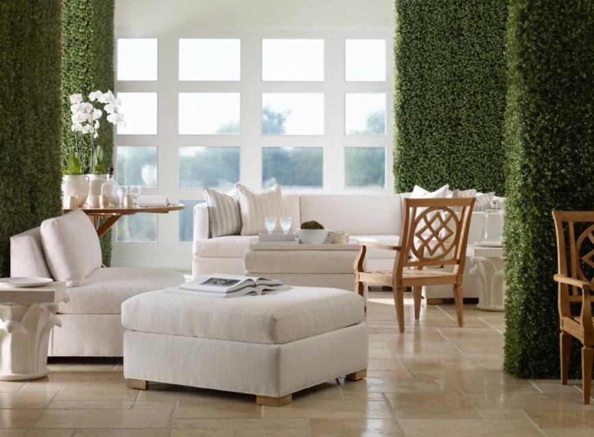Воспользуйтесь этим свойством при составлении декора. Покрасьте стены гостиной в белый цвет, поставьте в них белую деревянную мебель, например, книжный шкаф, комод. Однако выбирайте диван и другую мягкую мебель, например пуф или кресло с серой, светлой или темной обивкой.