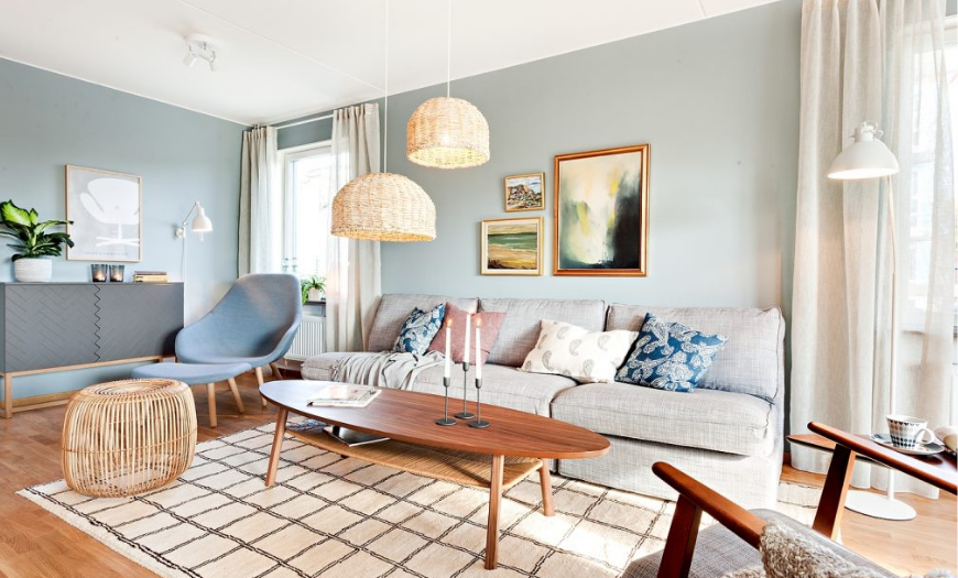По сравнению с оранжевым или красным, голубой цвет в гостиной — безопасное решение. Это пастельный и расслабляющий цвет, напоминающий голубое небо или море. Цвет успокаивает, но в то же время привносит в интерьер свежесть и немного летнего, теплого климата. Он не бросается в глаза, поэтому с голубым вы можете экспериментировать, сочетая с другими подходящими цветами, не боясь переборщить.