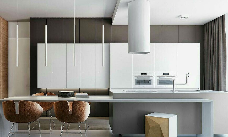 Застройщик обычно сам определяет, где будет находиться кухонный уголок, устанавливает там раковину, а под потолком скорее всего будет вытяжка. Вопрос, как отделить визуально кухню от остального пространства. Идеальный вариант — барная стойка. Она будет и компактным столом, и перегородкой. Если есть теплый балкон или лоджия, то можно объединить их с кухней, а из подоконника сделать стойку.