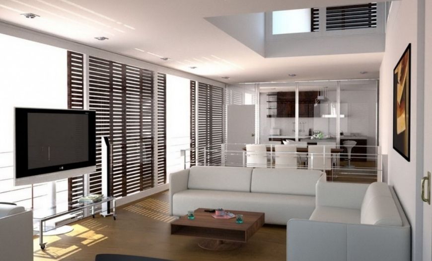 Гостиная-студия в частном доме может отличаться от квартиры площадью. Обычно дом представляет собой более свободное пространство