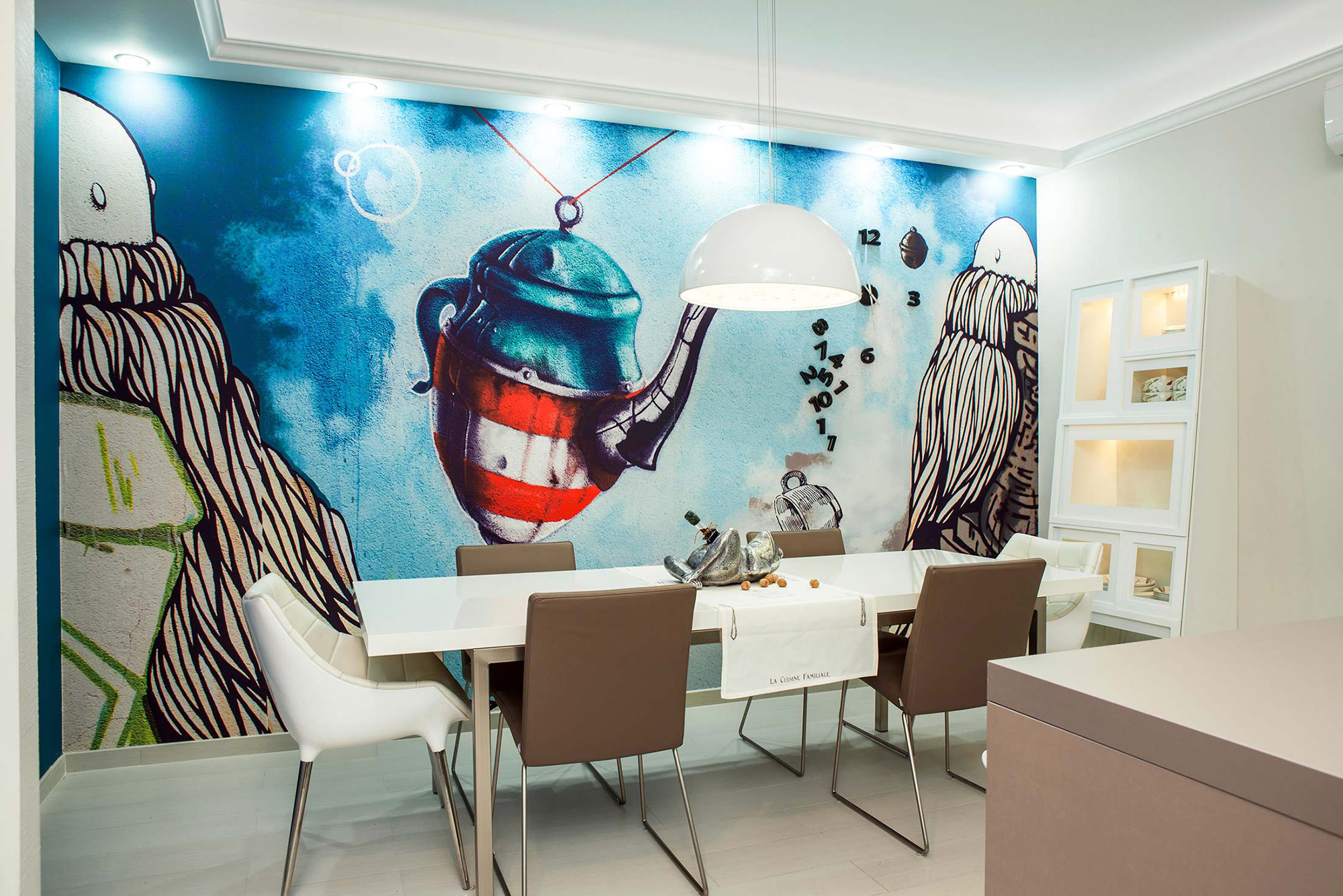 При выборе рисунка для кухонного помещения, стоит учитывать концепцию интерьера. Граффити можно полностью или частично нанести на фасады кухонного гарнитура, фартук или стенку, расположенную возле кухонного стола. Тематические рисунки с изображением продуктов питания, напитков и готовых блюд станут отличным решением для данной зоны.