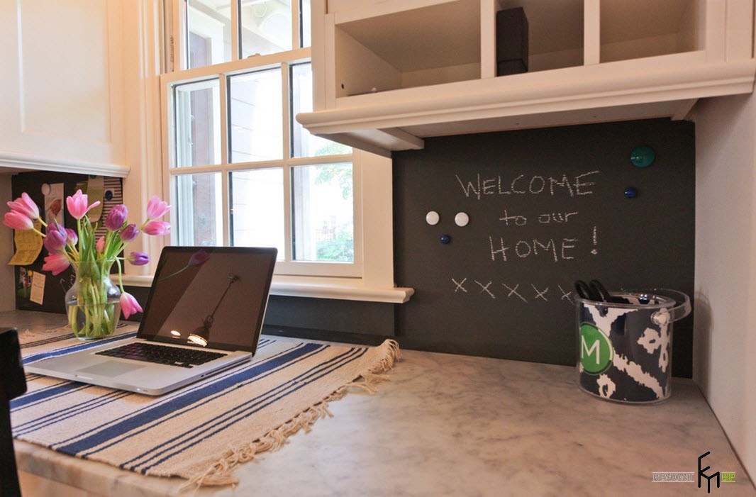 Над столом, возле стола или даже на самом столе, если его размеры позволяют — место для заметок будет везде. Доски для записей — это лучший органайзер, который никогда не потеряется, всегда будет на виду и сможет помочь в любой момент, стоит лишь стереть ненужное и записать новое. Там может разместиться любая информация: во сколько забрать ребёнка из школы, когда следующая встреча с клиентом, нужно ли сегодня покупать молоко, пароль от рабочей почты и план дел на неделю. Деловые и творческие люди, которые постоянно загружены делами и не могут найти даже минуты свободного времени по достоинству оценят свою дополнительную память в виде небольшой доски с грифельным покрытием.