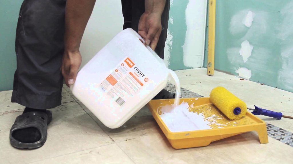 - Грунтовочный состав готовят к применению согласно инструкции. Разводят простой водой и наливают нужное количество в пластиковый лоток.
