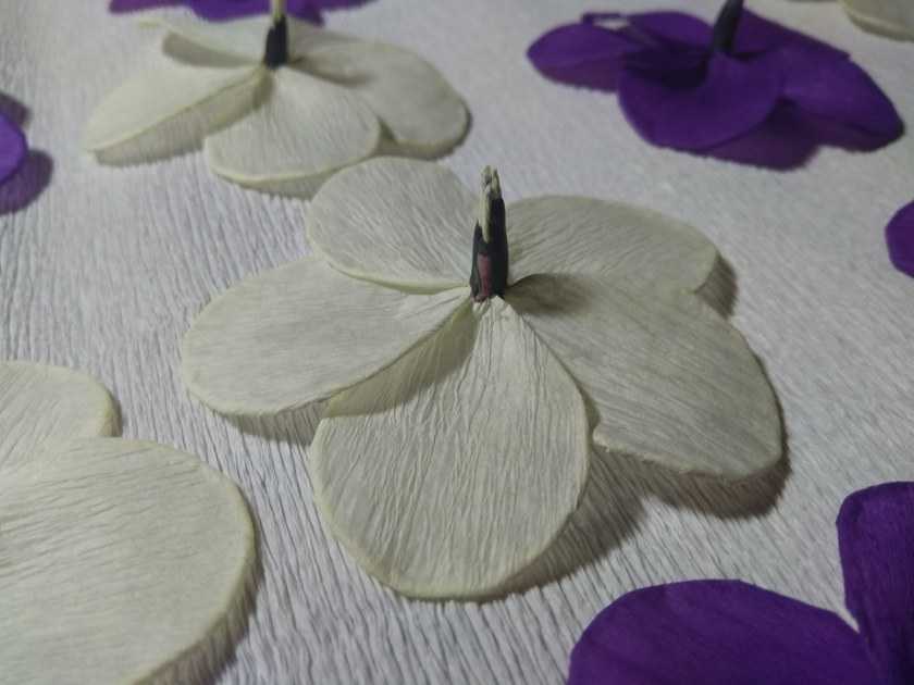 Из белой бумаги вырежьте сердцевинку, она понадобится несколько позже. Лепестки надо вырезать и немного скрутить, по нижнему краю склеить, как показано на картинке. И не забудьте придать им форму цветка. Готово!