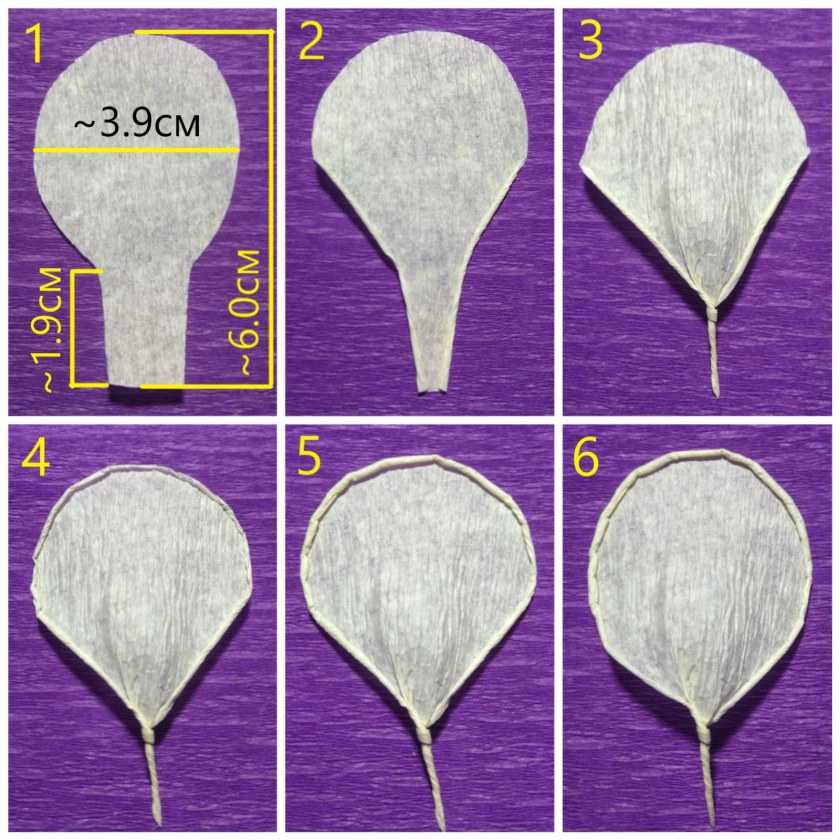 - Подготавливается 6 одинаковых прямоугольников, из которых вырезаются заготовки для лепестков. Размер подбирается в индивидуальном порядке. В данном случае это 60 на 30 мм.