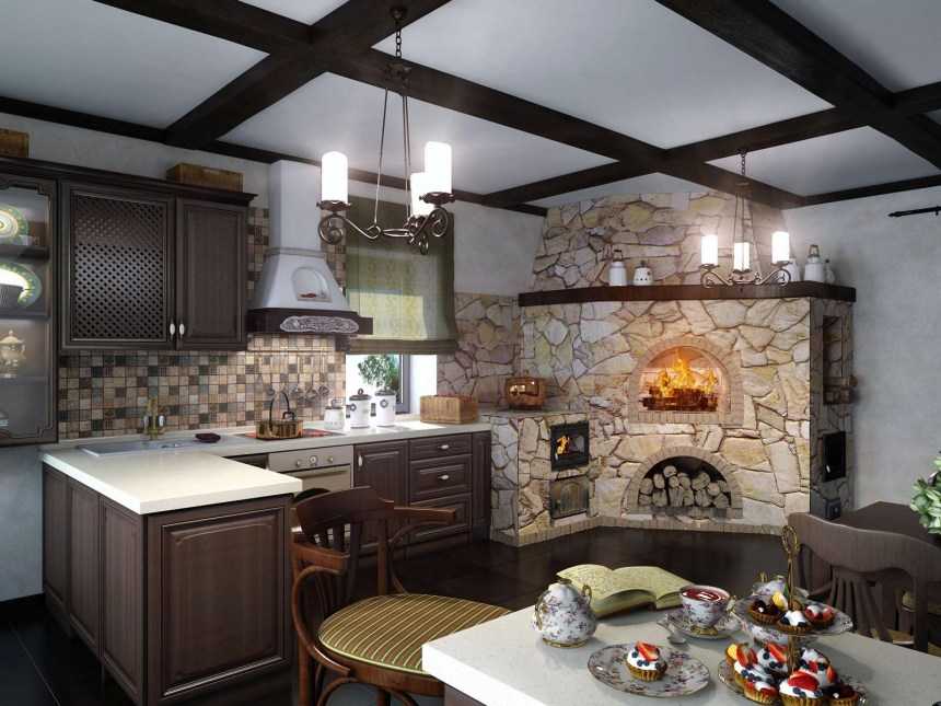 Достаточно роскошно и красиво выглядит кухонное помещение, в котором находится рабочая печь или камин. Обычно их кладут из красного обожженного кирпича. На основании проекта и технических условий выкладывается печная труба, выполняется вентиляция на основе расчетов воздухообмена в помещении.
