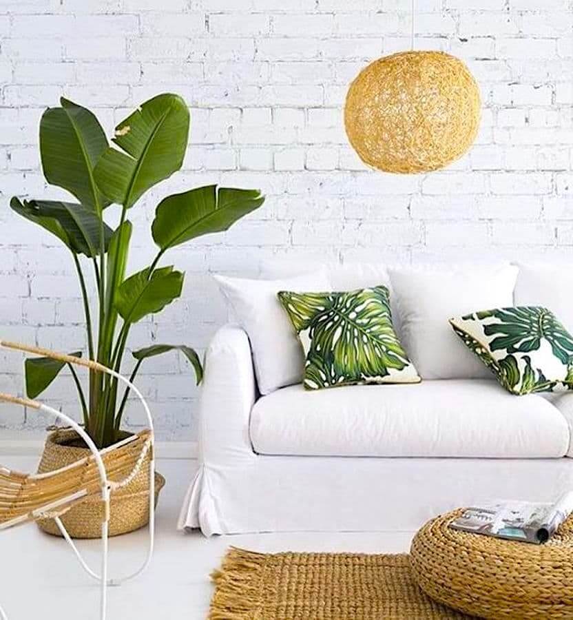 Разбавить монохромность белоснежного интерьера помогут комнатные растения и стилизованные под них декоративные подушки