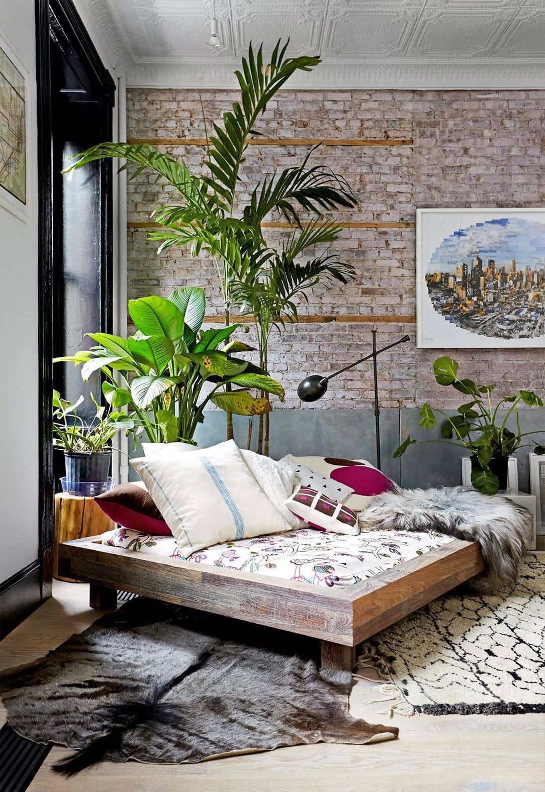 Этот проект как будто переносит нас в романтические 60-е – эпоху, когда зарождалось движение хиппи. Ковер сочного зеленого цвета, пастельных тонов торшер и подушки, яркий цветочный букет на светлом фоне – все это напоминает, что человек является всего лишь частью природы.