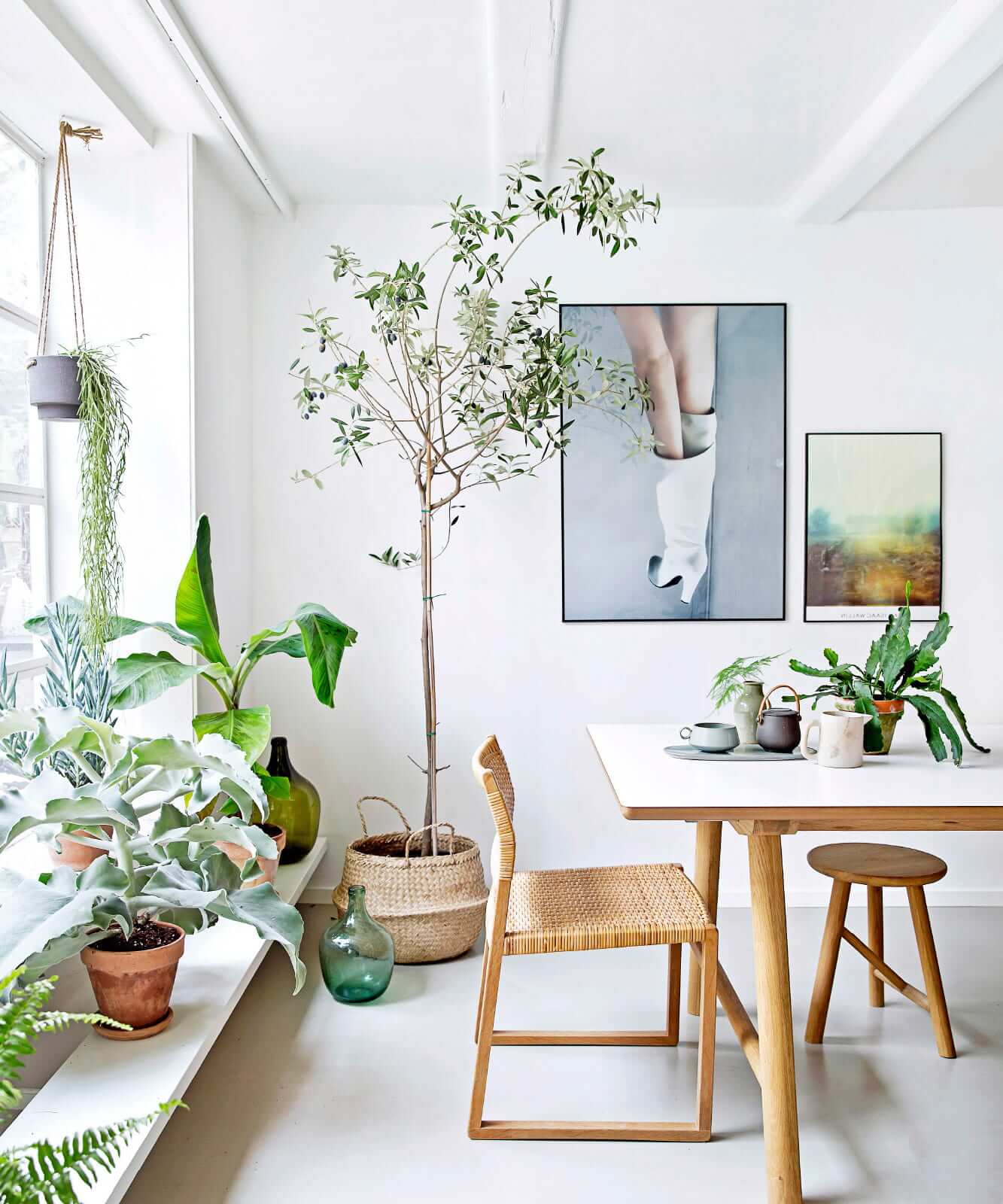 Светлый интерьер гостиной с красивыми комнатными растениями