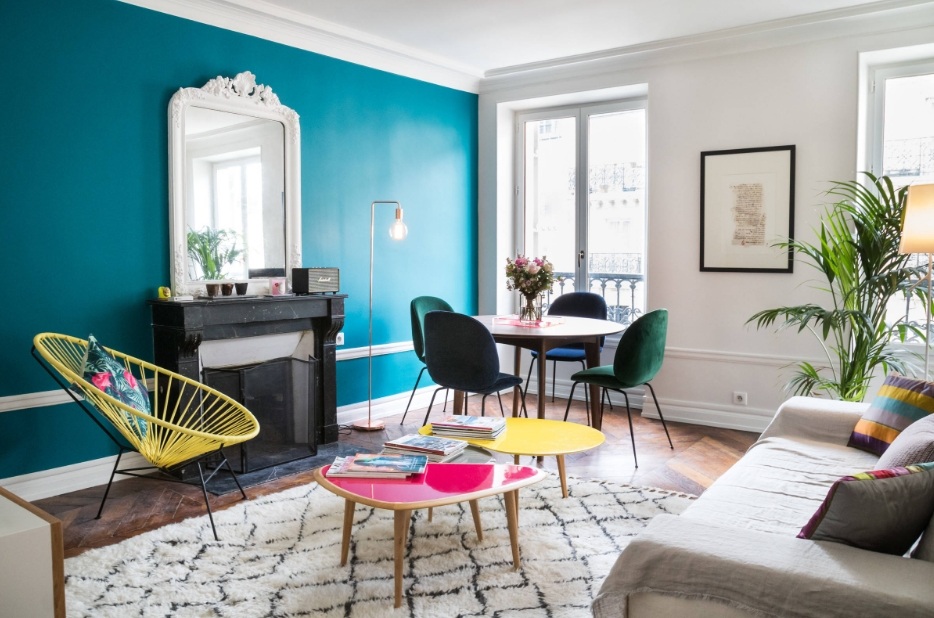 Чаще всего в яркий цвет выкрашивают только одну стену гостиной комнаты, в этом случае пространство не перегружается и не создается давящего ощущения. На контрасте с ярким цветом стены интересно будет смотреться светлая мебель.