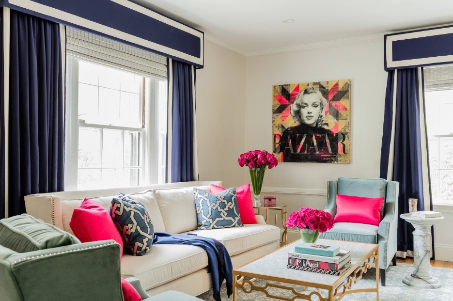 В текстиле и декоре должны быть деликатные пересечения с основным оттенком: в шторах, статуэтках, подушках. Мебель не стоит оформлять такого же цвета, иначе будет “перегруз”. Лучше выделять яркие акценты контрастно: например, это может быть белое пианино или черный диван, любое яркое пятно.