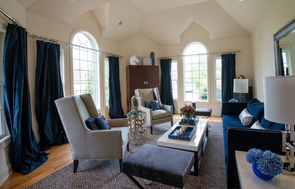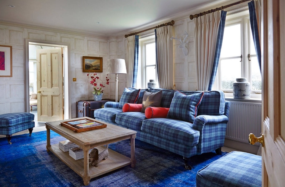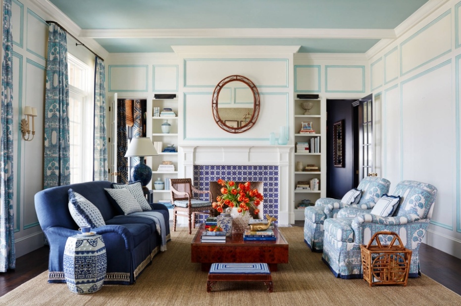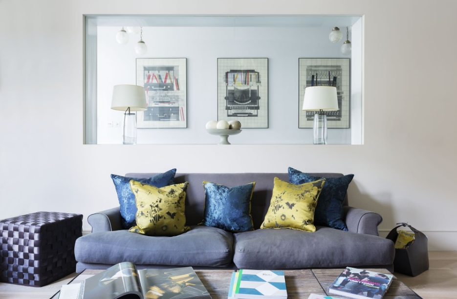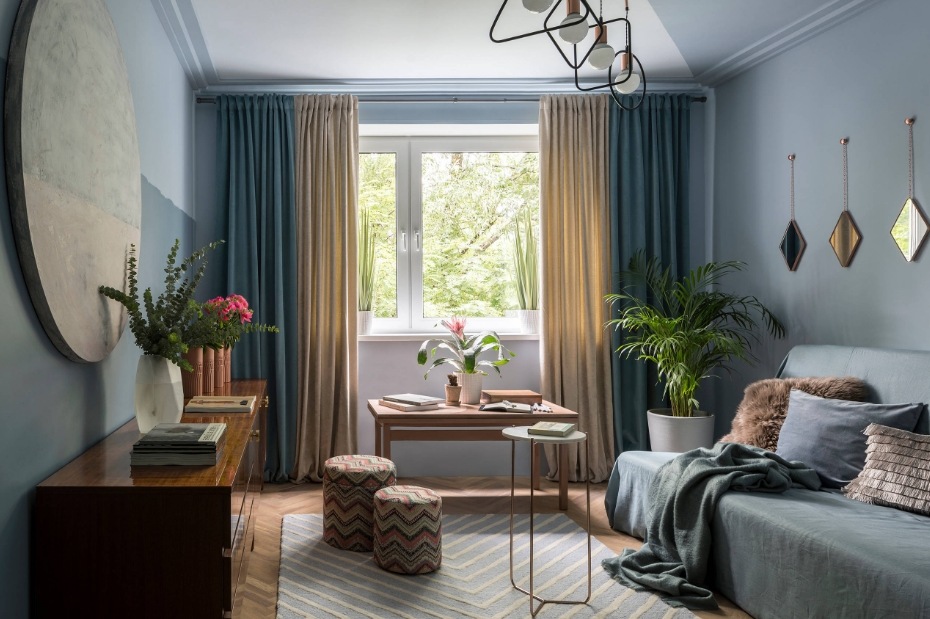 Аксессуары, декор, текстиль в интерьере голубой гостиной
