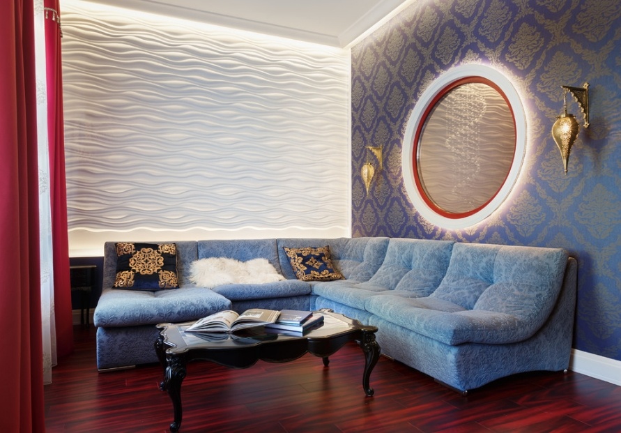 В естественном свете голубые стены с декором и мебелью в гостиной будут смотреться изумительно хорошо. Но вот искусственное освещение может все испортить, и будет неприятный сюрприз, а переделывать окажется уже поздно.