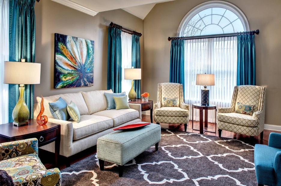 Голубая гостиная будет привлекательно выглядеть, если вы украсите ее окна шторами в бирюзовом цвете. При этом лучше всего отдать предпочтение шторам простой формы из плотной ткани, которая бы на тон была ярче стен. Если вы не желаете