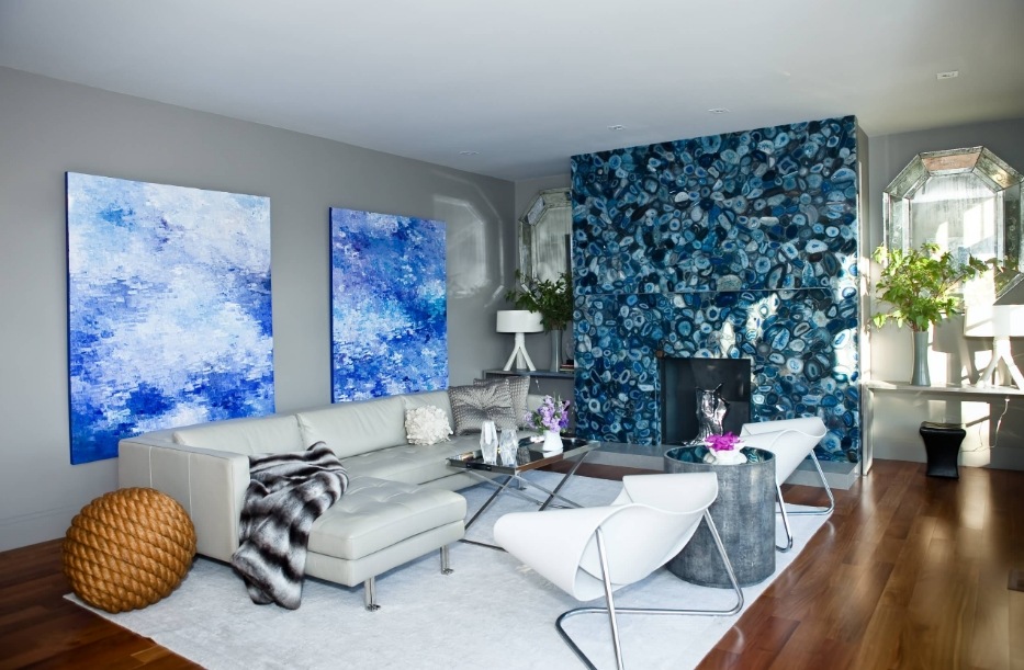 Если вы делаете гостиную исключительно в голубых тонах, то разбавляйте их оттенками гаммы. Можно выделить одну основную стену более ярким, конкретным цветом – бирюзовым или небесно-синим. Это будет основа интерьера, тут должна быть картина или диван, центр вашей гостиной.