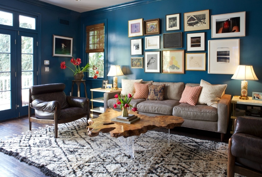 Гостиная, выполненная в современном стиле, позволит задействовать больше красок. Стены могут быть ярких цветов, например бирюзовый, серый, синий или изумрудный.