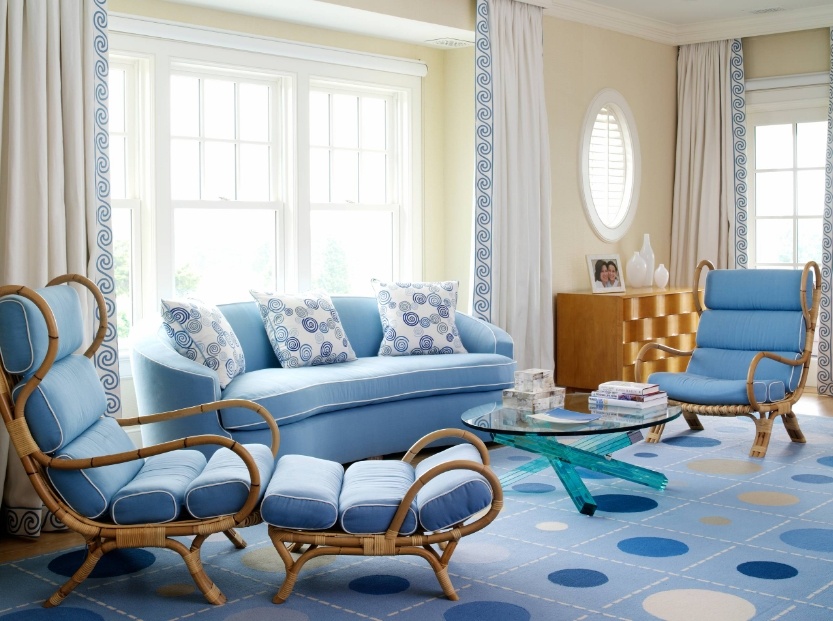 - Не бойтесь приобретать мебель с ковкой для гостиной комнаты или зала в голубых тонах. Такая мебель может задать настроение и напомнить о теплом лете на даче. То же касается и плетеных диванов с креслами.