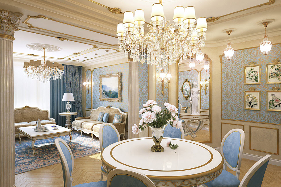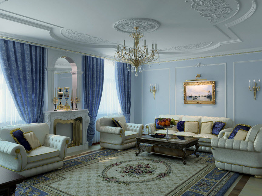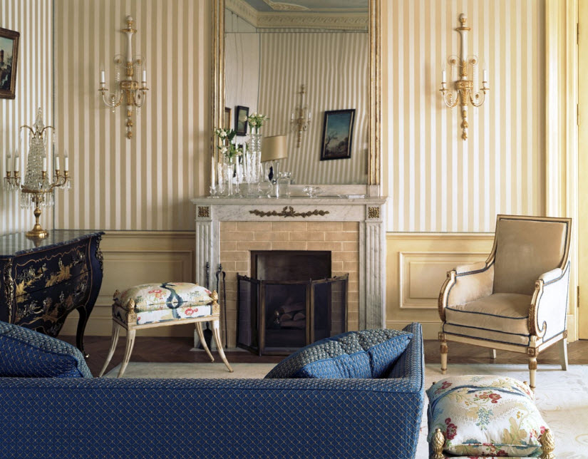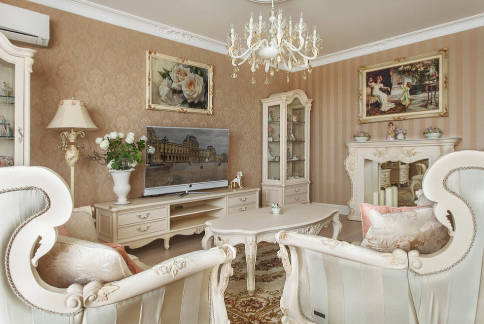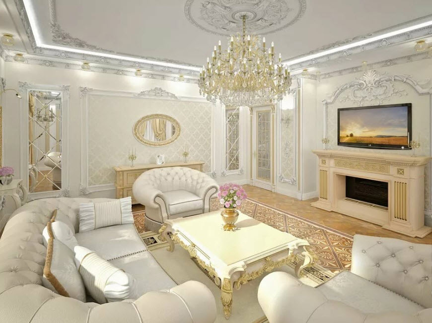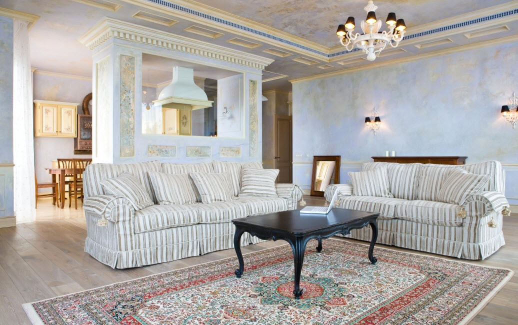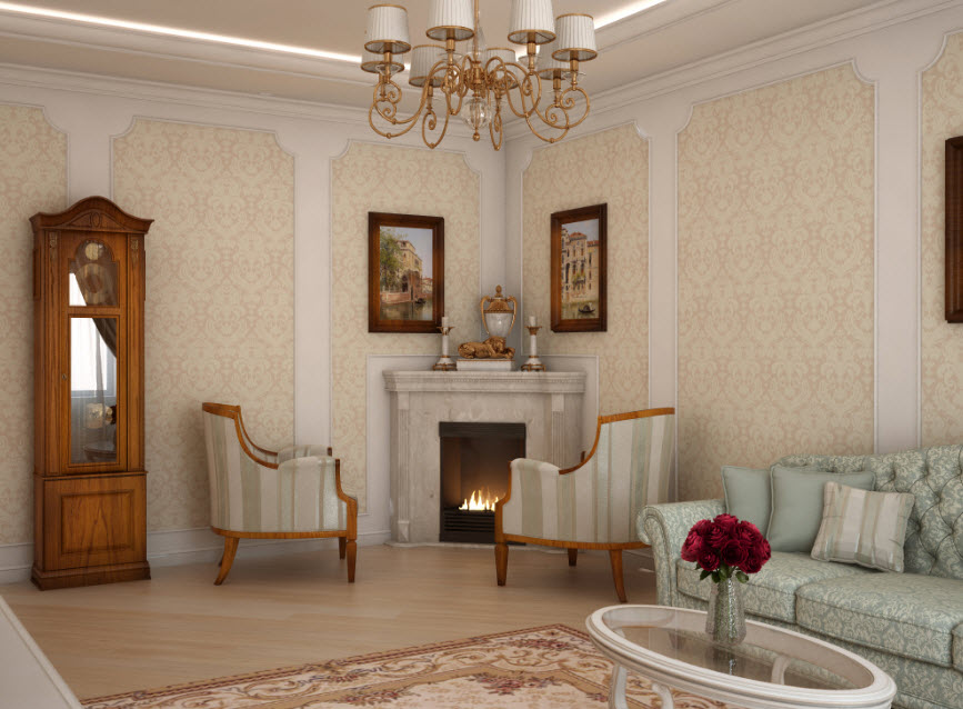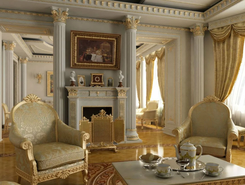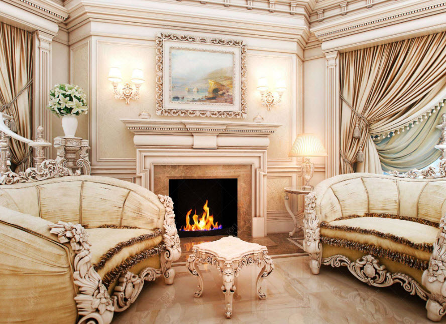 Создание однотонного основания в пастельных тонах. Для отделки используют колоны и лепнину, декоративную штукатурку. Дополнить изысканную атмосферу поможет настоящий дровяной камин.