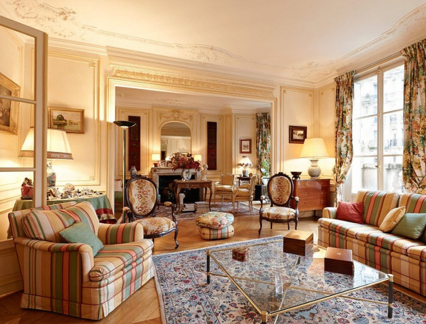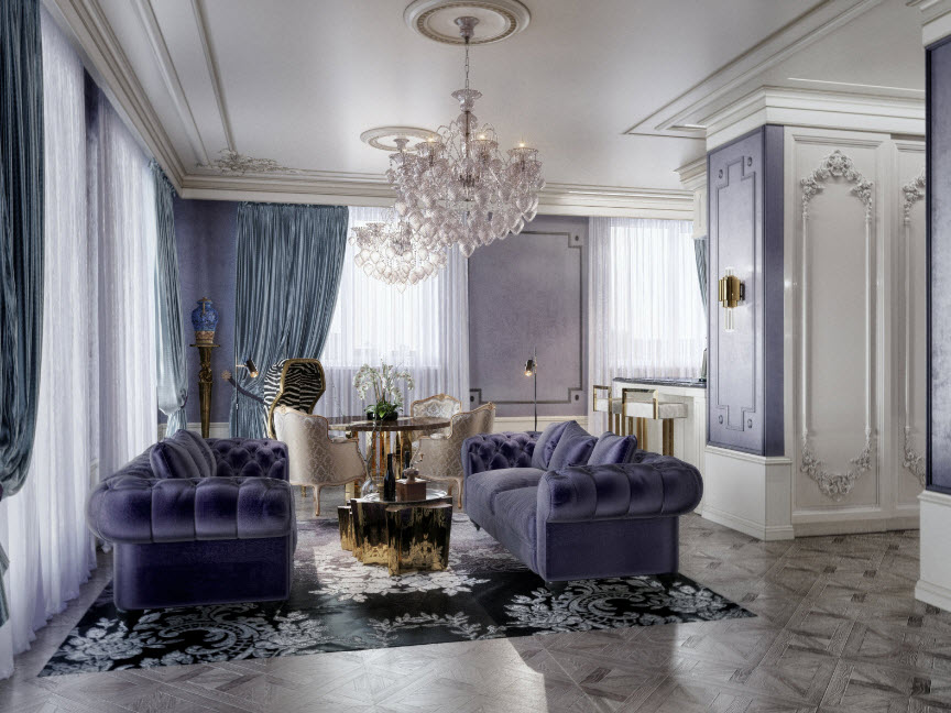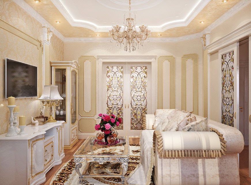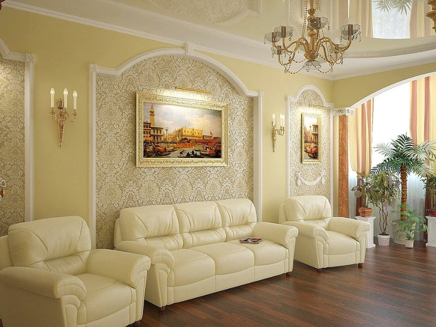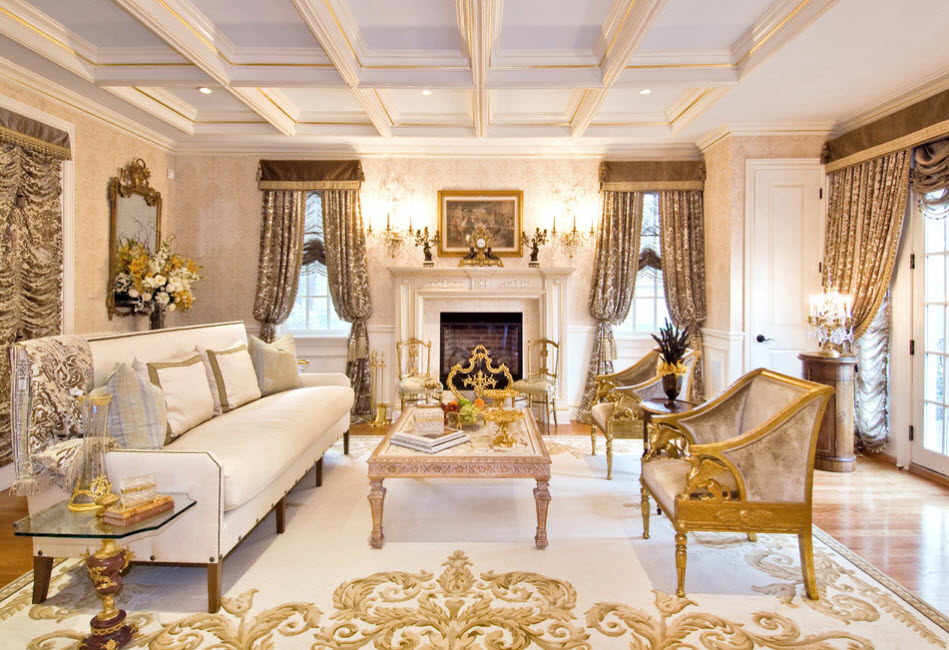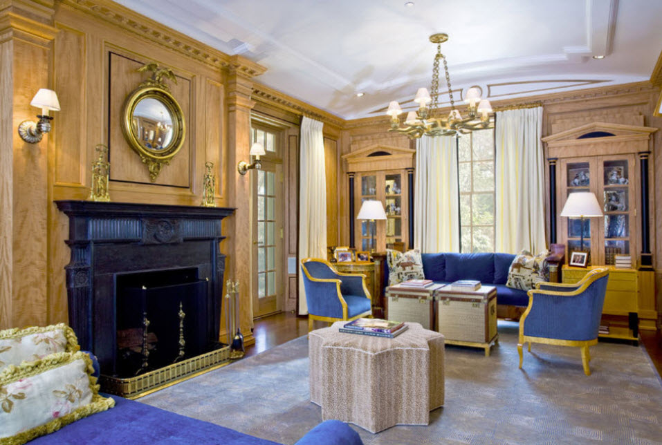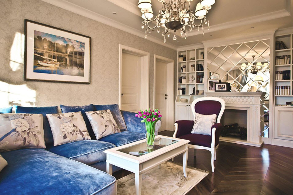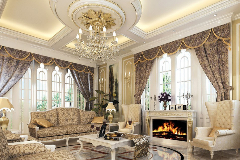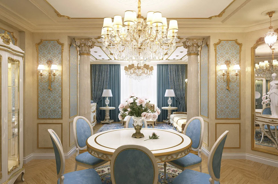 Создание однотонного основания в пастельных тонах. Для отделки используют колоны и лепнину, декоративную штукатурку. Дополнить изысканную атмосферу поможет настоящий дровяной камин.