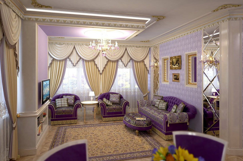 Особую роль в оформлении интерьера играют занавеси. Обычно их подбирают под цвет стен или мебельной обивки. Важно, чтобы они гармонировали со стилистикой комнаты в целом.