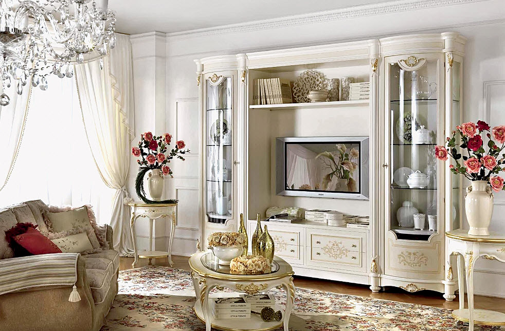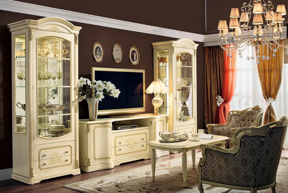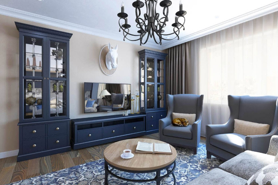 Мебель должна соответствовать общему стилю дизайна помещения. Например, для классического стиля характерны рамочные или стеклянные фасады, диваны, тумбы или комоды на изогнутых рельефных ножках. В минимализме используются модульные гарнитуры с гладкими дверцами и столешницами.