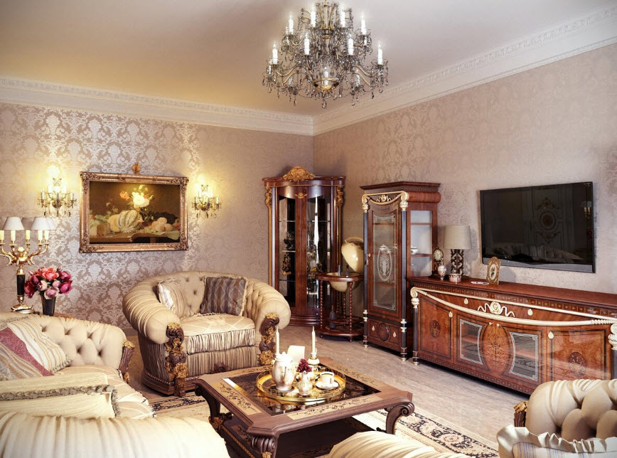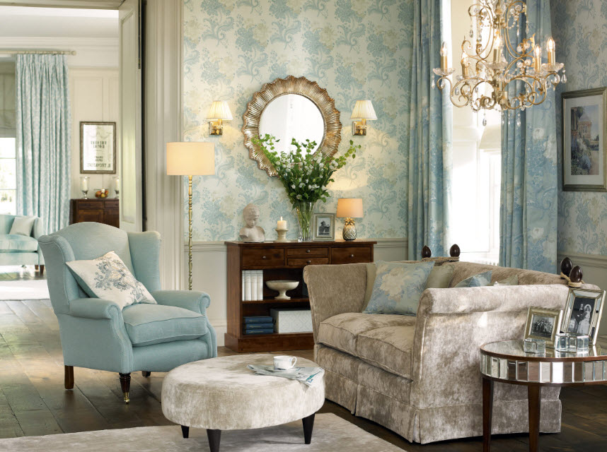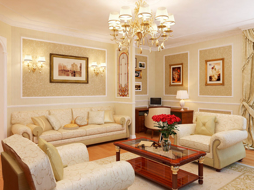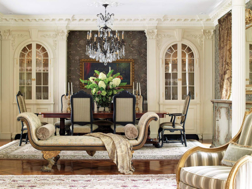 Классический стиль требователен к декору, ведь оформить интерьер нужно изысканными и дорогостоящими предметами. Например, аутентичность направления подчеркивают люстры и зеркала, живописные картины, кованые подсвечники и статуэтки. Не менее привлекательно выглядят мраморные изделия, а также предметы, выполненные из бронзы и фарфора. Также здесь найдется место позолоченному декору и предметам антиквариата, пейзажам и портретам в дорогих рамках. Если говорить о текстиле, то нужно использовать натуральные дорогостоящие ткани, цветовая гамма которых дополняет интерьер.