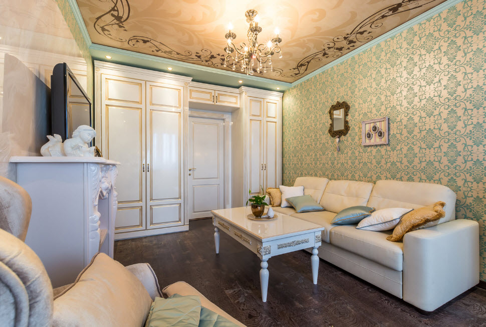 Для отделки потолочного пространства можно использовать различные предметы дизайнерского творчества, демонстрирующие изысканный вкус домовладельца. К примеру, потолок украшают фризами, позолоченной лепниной и ручной росписью. Что касается основного материала, то потолок достаточно побелить или поштукатурить, навесные и гиспокартонные конструкции здесь не приветствуются.