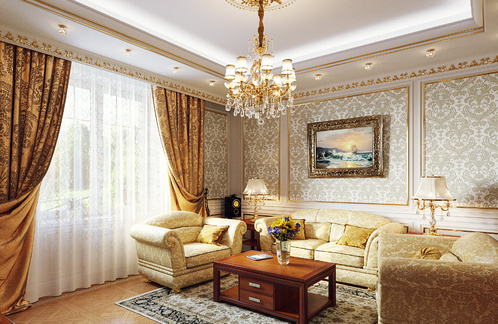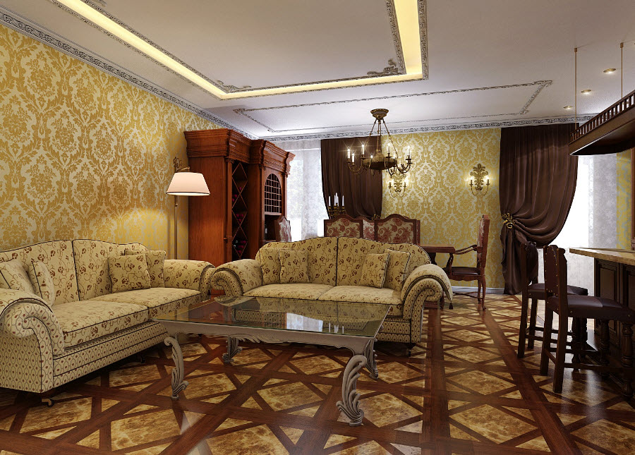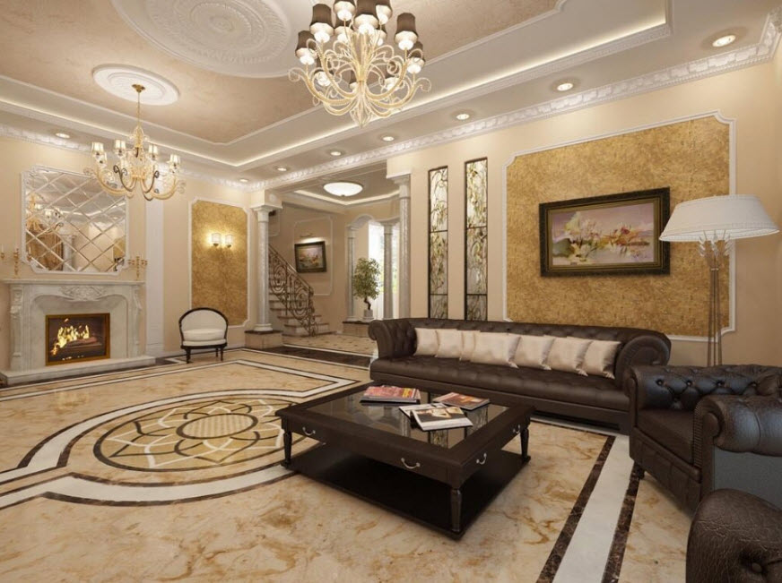 Отобразить изысканность классического стиля, прежде всего, нужно в отделке стен, пола и потолка. Ранее мы уже говорили о том, что лучше всего демонстрируют роскошь природные материалы высокого качества. К сожалению, позволить себе использование камня и других материалов могут не многие, поэтому современный интерьер в классическом стиле допускает использование высококачественным синтетических аналогов.