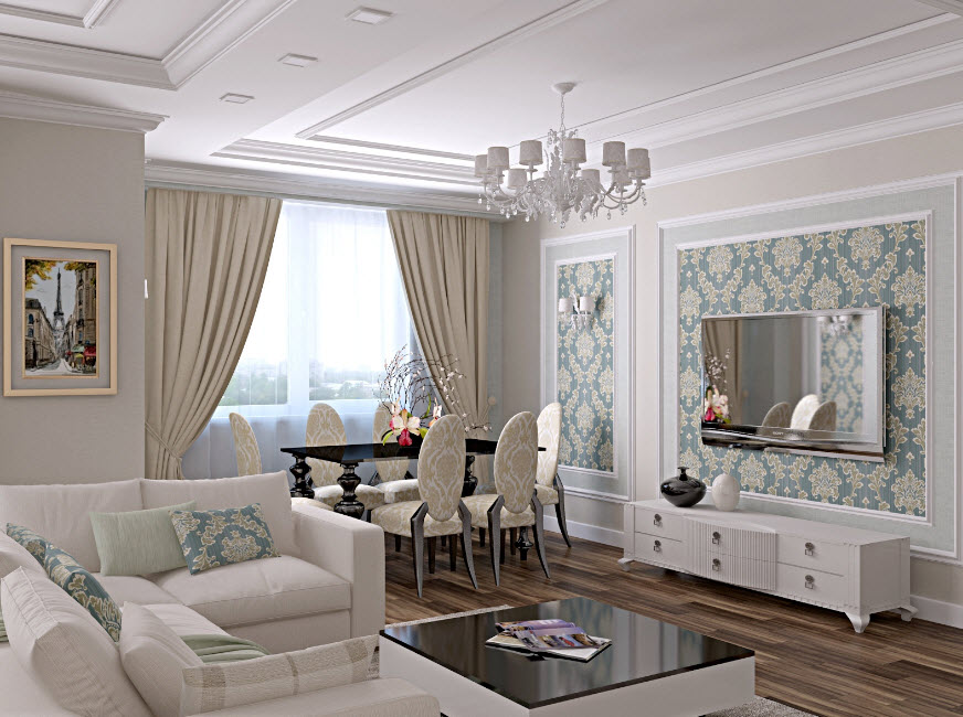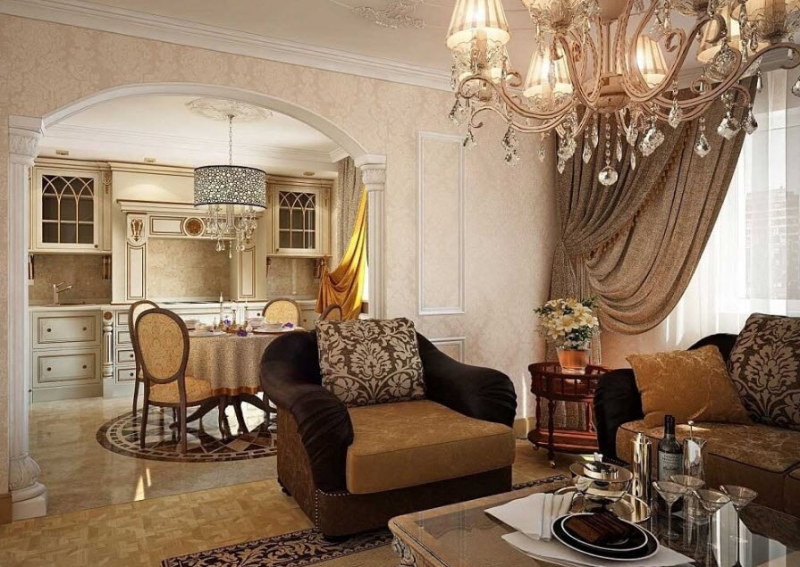Неважно большой планируется комната или маленькой, в ней все равно должны гармонично размещаться все предметы интерьера на определенной дистанции друг от друга. Если гостиная будет совмещена с кухней или столовой, стоит условно наметить декоративную стену или арку, которая разделит пространство на разные функциональные зоны