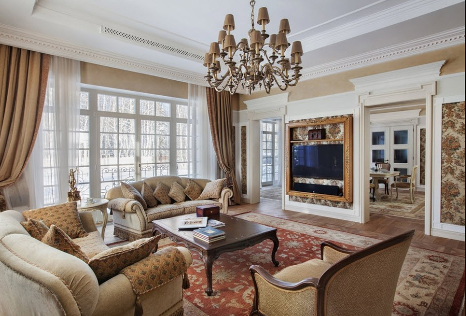 - кроме того, в такой гостиной просто обязаны быть как минимум два больших окна, это добавит естественного освещения в комнату и сделает ее уютнее;