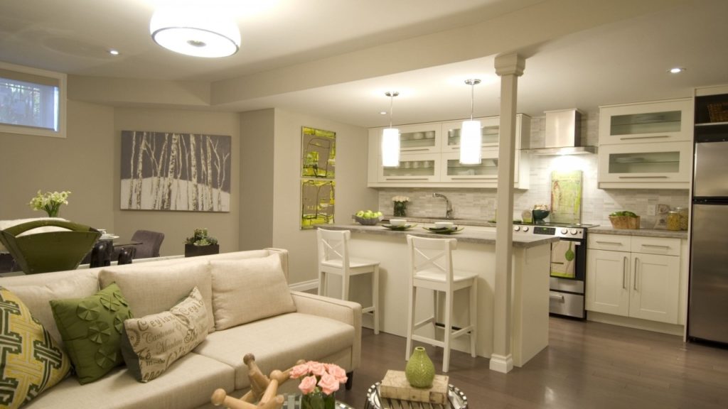 Интерьер в помещении необходимо схематично разделить до момента фактического демонтажа стены. Оптимальным считается использование трех небольших зон: гостиная, «островок кухни» и столовая