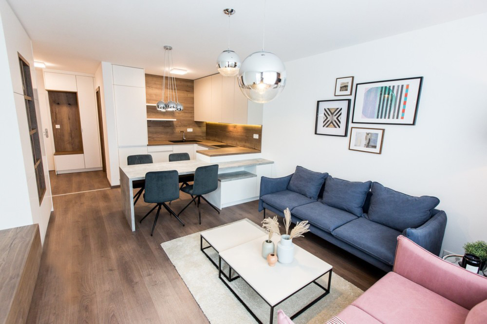 При расширении полезной площади за счет объединения 2-3 смежных комнат появляется больше свободного места. Это дает дополнительный бонус при выборе стилистики.