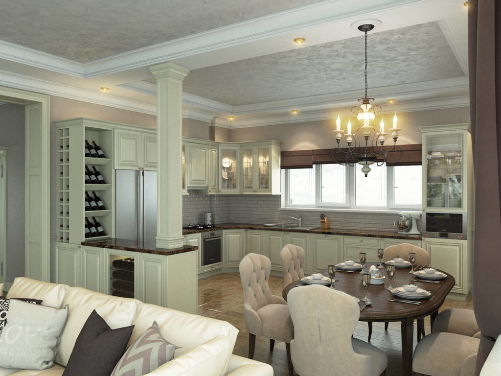 Для любителей основательных домов, когда строят «на века», передавая имение по наследству, стоит ориентироваться на классику или историческую стилистику. Она не выходит из моды, только немного трансформируются подходы в реализации дизайна интерьера кухни-гостиной в частном доме.
