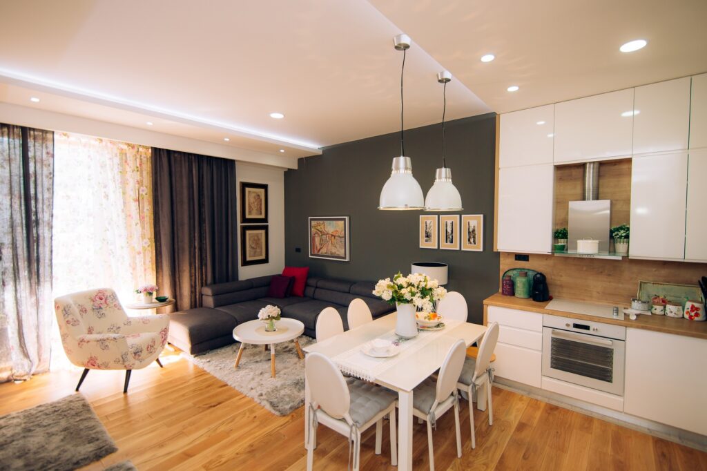- Роль освещения. Использование различных типов ламп или даже лампочек позволит визуально выделить отдельные комнаты. Помните, что на кухне должно быть немного больше света, чтобы облегчить приготовление блюд. В гостиной поставьте атмосферные приглушенные лампы, способствующие расслаблению. Модный подвесной светильник над кухонным островом создаст неповторимое пространство!