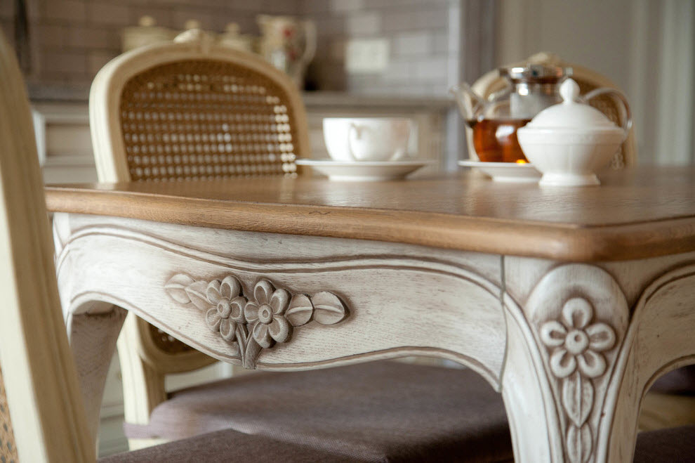 Кухню в стиле прованс обставляют деревянной мебелью. Столешницы, стулья, шкафы и полки должны выглядеть так, словно им уже четверть века.