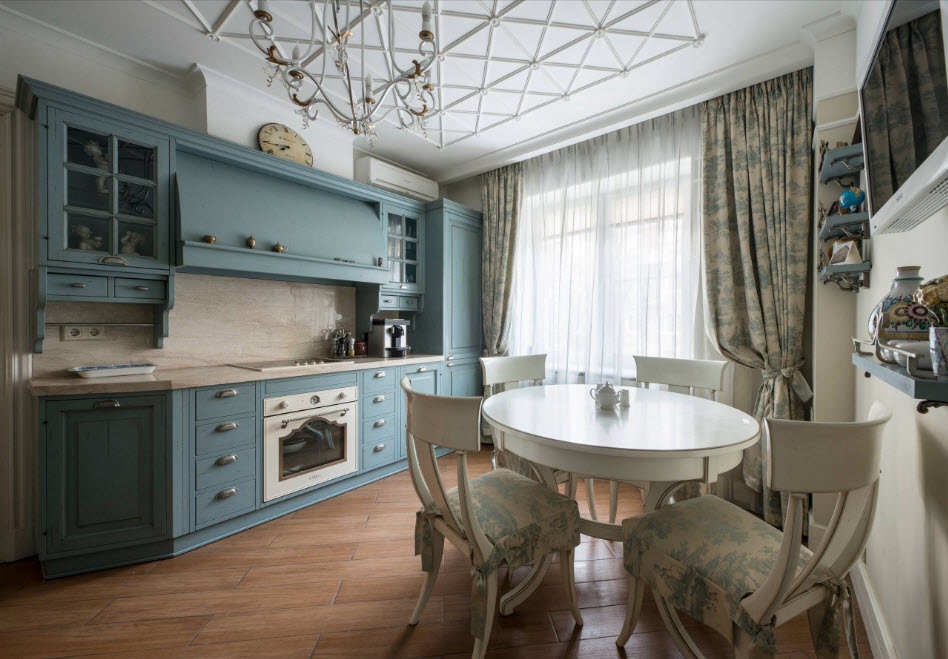 Подберите для кухни прованс громоздкий буфет, массивный стол, а микроволновку и тостер спрячьте в шкафу. Ведь тогда, когда зарождался этот милый стиль, электричества не было и в помине.