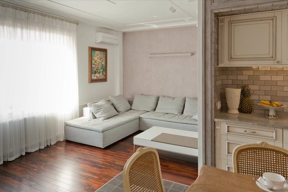Чтобы сделать красивым и уютным такой интерьер – используйте разную отделку для потолка, стен и полов. Поделите помещение на зоны: для кухни – яркие фасады, многоступенчатый потолок, для прихожей – практичные напольные покрытия или решетки.