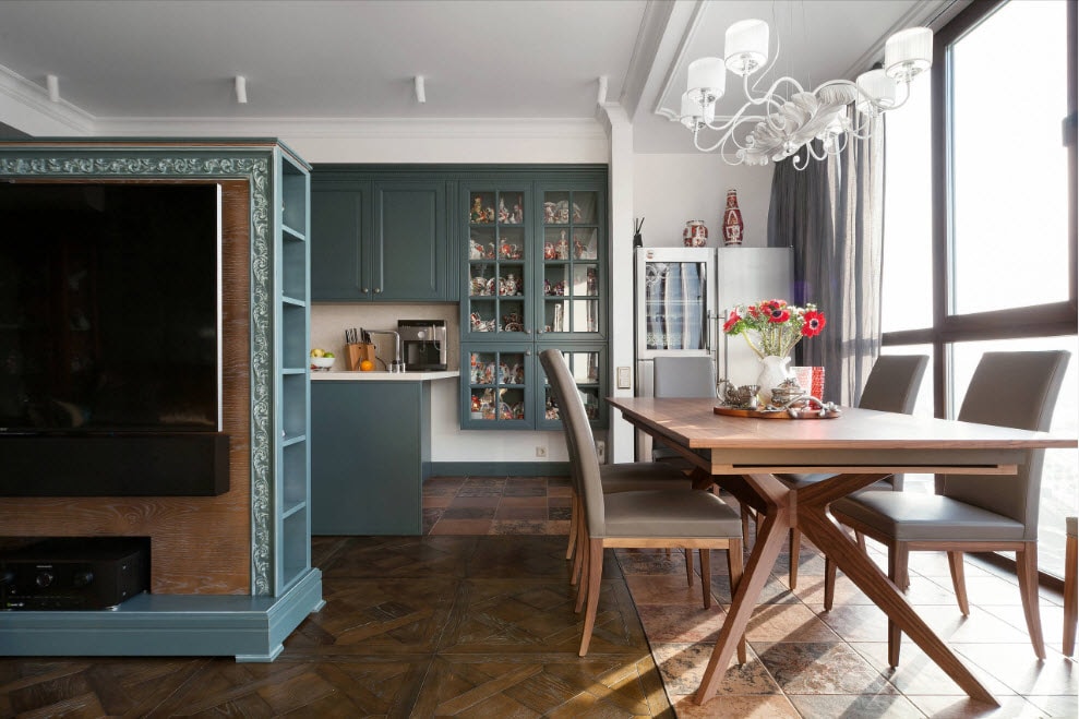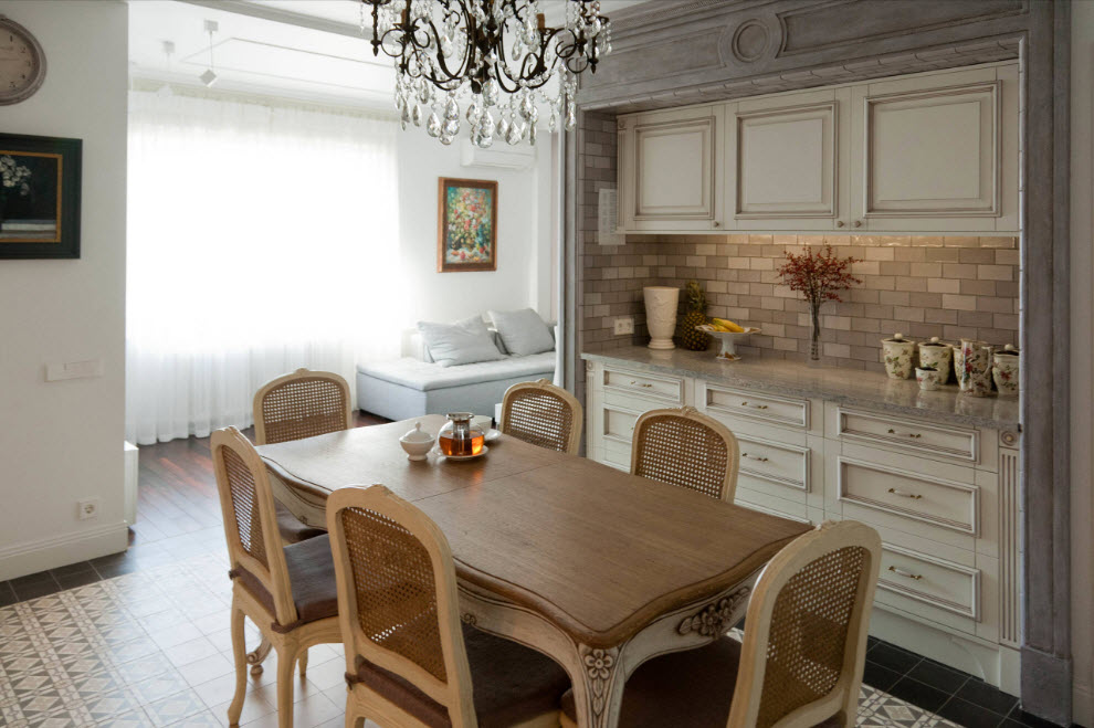Просторная комната позволяет обратиться к стилю неоклассики. Теплая палитра цветов и утонченная классика на кухне производят впечатление теплого домашнего очага, куда поскорее хочется вернуться.