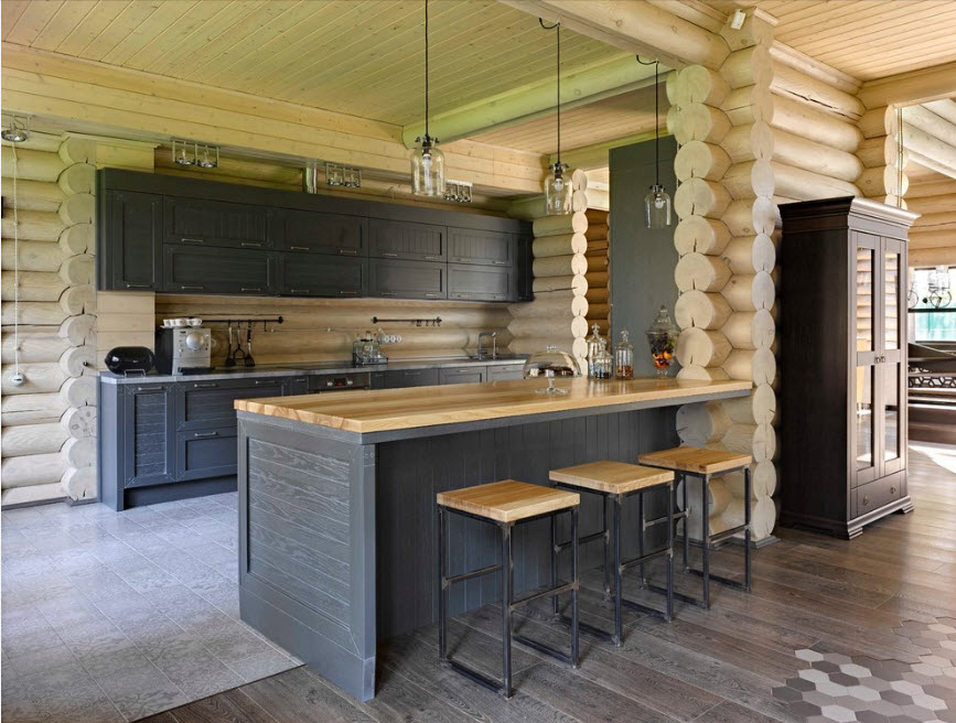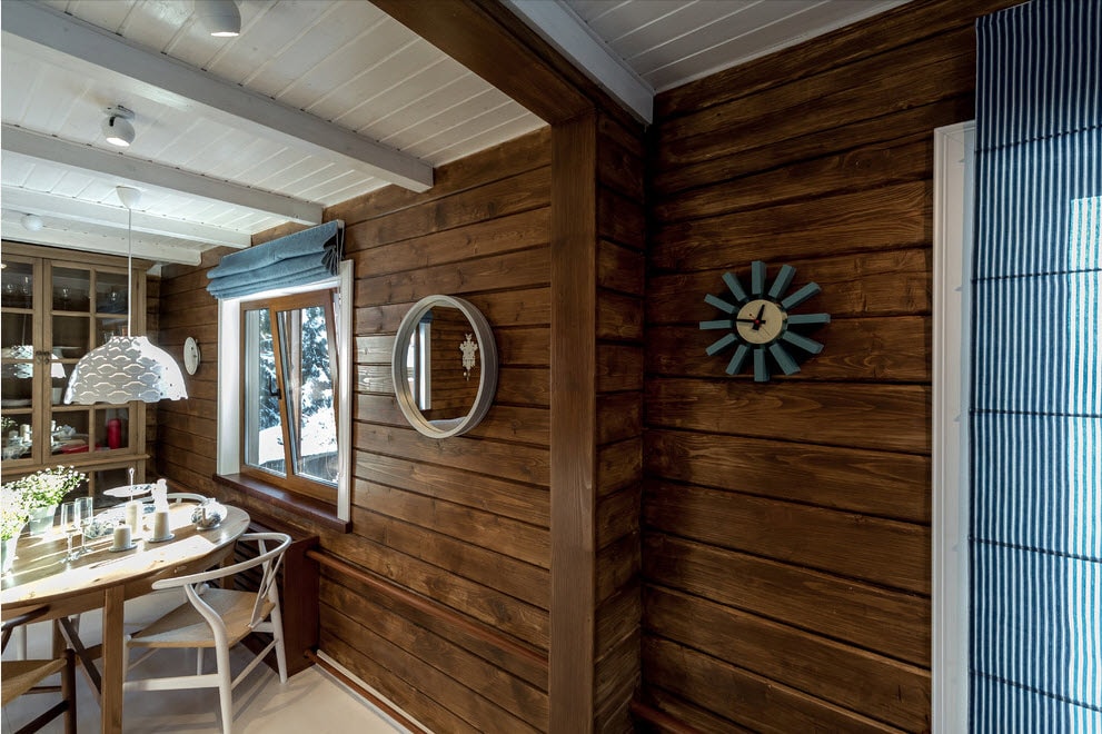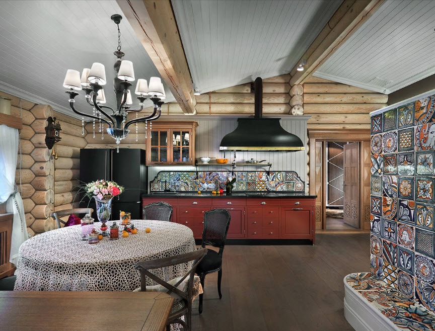 Основополагающими и ключевыми решениями в оформлении этой кухни в старом частном доме стали ретро-детали, деревянные стены, печь-камин и возведенная перегородка из бруса, разделяющая помещение на кухню и гостиную зону.