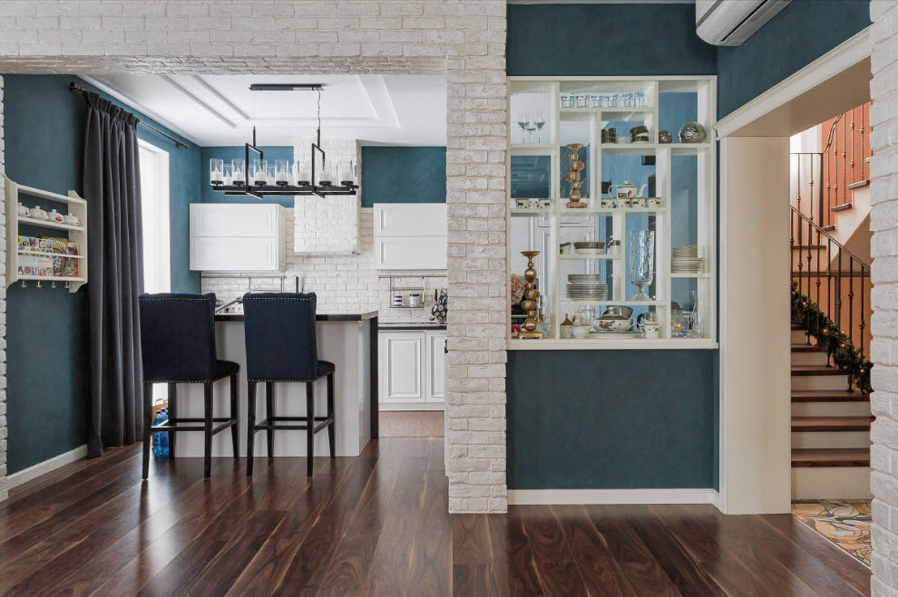 Как отделить кухонную зону от зоны отдыха? Таким разделителем послужит красивая барная стойка, раздвижная перегородка, невысокая гипсокартонная стена.