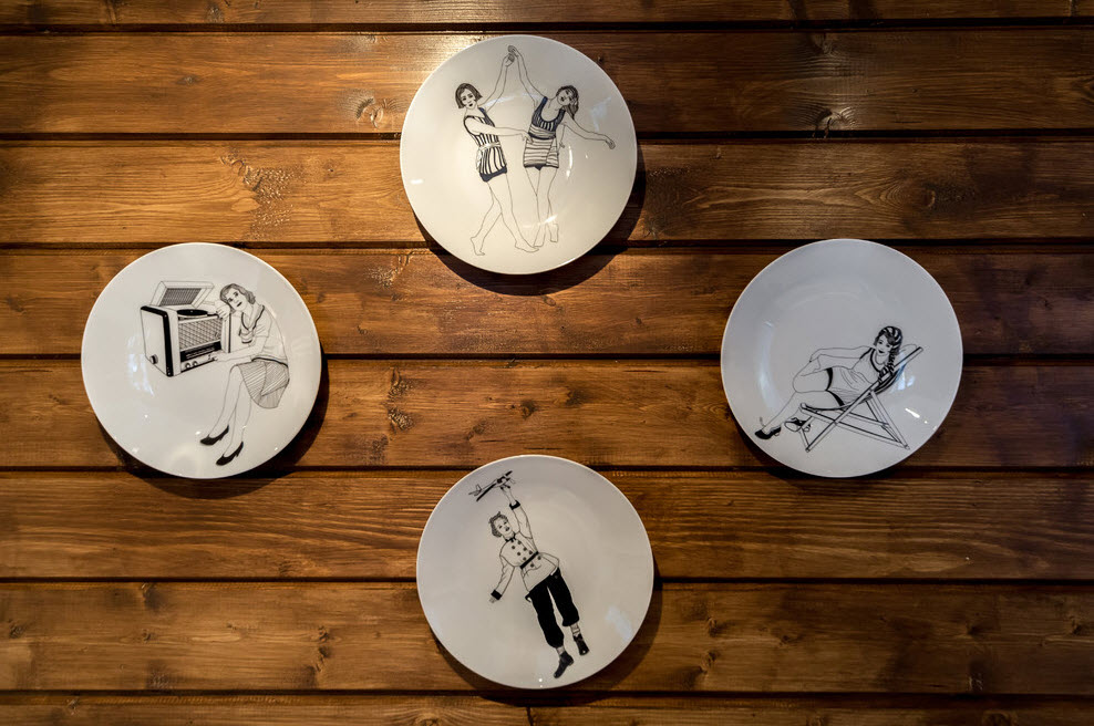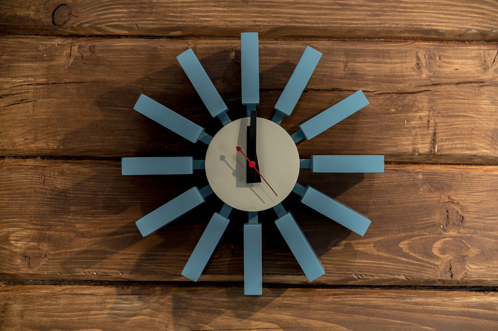 Яркие акценты тщательно продуманы дизайнерами. Оригинальные часы с деликатной римской шторой соответствуют цветовой тематике на кухне, а фарфоровые белые тарелки с характерными рисунками подхватывают советский шарм – идеально сочетаются с белой стеной, дополняя дом винтажной атмосферой.