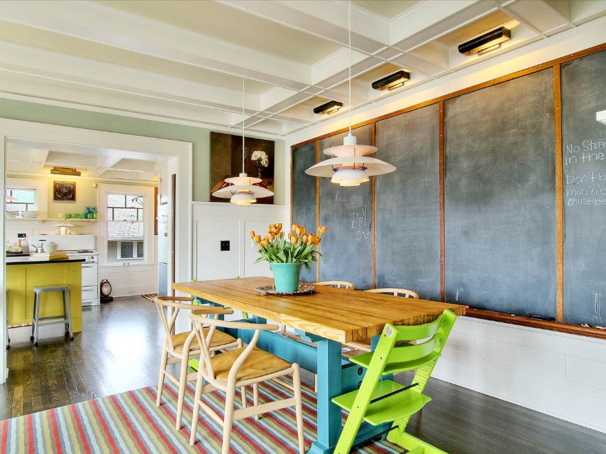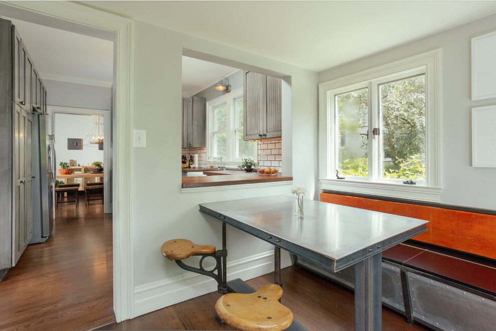Потрясающе будет смотреться обеденная зона со скамьей. Это также отличное место для экономии пространства, потому как скамейка занимает гораздо меньше места, нежели несколько стульев.
