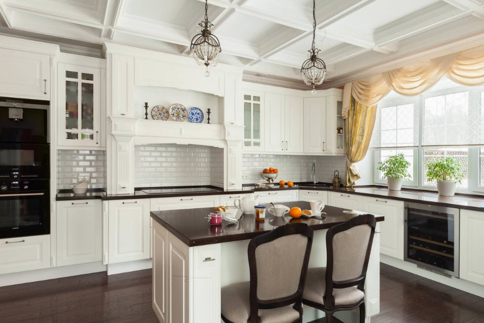 Неоклассика – наилучший дизайн для просторной проходной или совмещенной кухни частного дома. Главные требования этого стиля – большая площадь и высокие потолки.